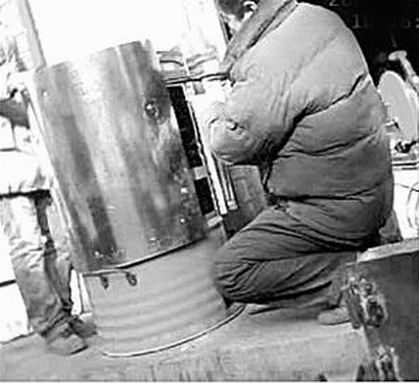 昨天(12月24日),記者來到天橋區(qū)臧家屯小區(qū)附近,一條街旁有幾家加工鐵爐子的業(yè)戶,其中一家業(yè)戶前擺著一些大鐵桶,業(yè)戶在一個(gè)藍(lán)色的大鐵桶前忙活著。記者走近一看,業(yè)戶在加工地瓜烤爐,他給藍(lán)色的大鐵桶包上半米高的白色鐵皮。“你這里加工地瓜烤爐嗎?多少錢一個(gè)?”記者問!300多元一個(gè)!睒I(yè)戶指著正在加工的大鐵桶說,“這個(gè)烤爐已經(jīng)有人買了,你如果想要烤爐,先挑個(gè)鐵桶吧!