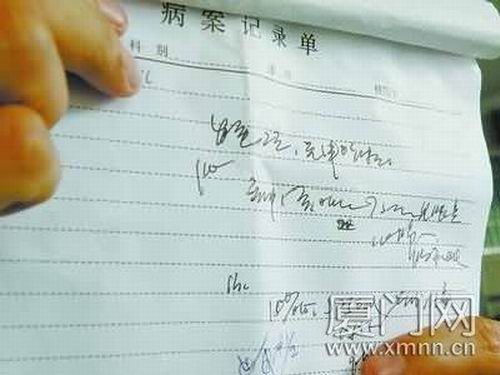 1日下午,在市內某大醫(yī)院的兒科候診區(qū),記者隨手向一名帶孩子前來復診的家長借了份病歷,一看就懵了:除了“09.2.1”的日期和表示藥物劑量的幾個阿拉伯數(shù)字能看清,其他字跡根本無法辨認!搬t(yī)生寫字都是這樣。”這位家長說,他從來就不去看病歷,看了也看不懂。