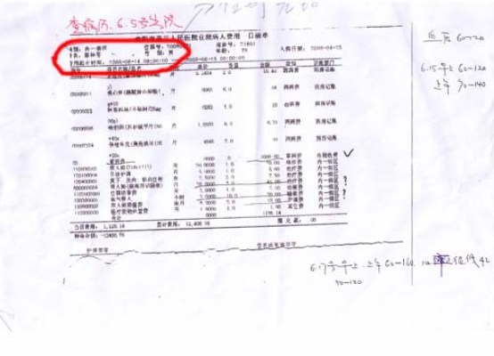 第一份清單是她母親席桂芬的。席桂芬今年80歲,是南陽市商業(yè)局的離退休干部,多年來患有高血壓、糖尿病、老年癡呆癥等,近年來經(jīng)常在南陽市第三人民醫(yī)院住院治療。清單顯示的時(shí)間為“2007年10月29日至30日(前日零點(diǎn)至次日零點(diǎn),下同)”,李冰特意在兩行費(fèi)用上用紅筆作了標(biāo)記:一次性用品,單價(jià)10元,套數(shù)258套,合計(jì)金額2580元,類別為其他費(fèi)用。也就是說,在醫(yī)療費(fèi)用之外,席桂芬這一天揮霍掉了258套一次性用品。第二份清單上,時(shí)間為:2008年6月14日,其母親的性別變成了“男”。