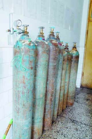 尉氏縣一些群眾向記者反映,尉氏縣第二人民醫(yī)院繼續(xù)使用工業(yè)氧冒充醫(yī)用氧。昨天上午,記者來到該院病房樓一樓內(nèi)科住院部,在一個(gè)標(biāo)注有搶救室的房間里,放著7個(gè)氧氣鋼瓶,沒有醫(yī)用氧氣合格證、沒有藥品批準(zhǔn)文號、沒有生產(chǎn)日期,甚至鋼瓶上沒有氧氣生產(chǎn)廠家的名字。有的鋼瓶上的檢驗(yàn)標(biāo)志注明使用時(shí)間為2004年至2007年。一個(gè)鋼瓶上還裝著吸入器,病房內(nèi)的患者告訴記者,患者吸的就是鋼瓶內(nèi)的氧氣。