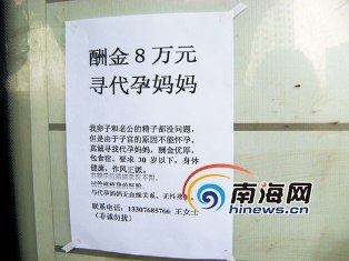 今天下午4點許,南國都市報記者來到海口市海府路汽車東站對面的公交車站看到,在站牌上貼有2張代孕廣告,廣告大致內(nèi)容如下:“酬金8萬元找代孕媽媽”,因自己子宮問題不能生育,真誠尋找“代孕媽媽”,酬金優(yōu)厚,包食宿,要求對方年齡30歲以下,身體健康,作風正派。聯(lián)系人為王女士,手機號碼13307685###。