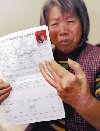 若干年前的一次工傷,讓沈河區(qū)北二經(jīng)街的居民王桂蘭成為國家三級肢殘。但這一事實在上周五被“改變”了,在經(jīng)歷了一次新殘疾證換證的例行體檢之后,60歲的王桂蘭被醫(yī)生告知,她已經(jīng)是“正常人”了。這一結(jié)果讓王桂蘭大惑不解,她舉著殘廢的左手質(zhì)問醫(yī)生,“為啥?”醫(yī)生回答:“你必須手指頭全沒了才能算殘疾!