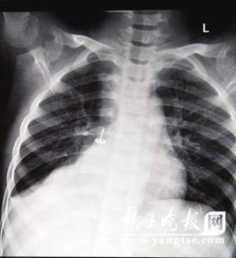 小杰的母親告訴記者,他們一家來自安徽明光,自己和孩子的父親都在外打工,小杰從小就由爺爺奶奶照顧。從去年夏天開始,爺爺奶奶就告訴他們,小孩身體不好,總是感冒咳嗽。后來發(fā)展到幾乎每隔一個(gè)星期,小杰就感冒發(fā)燒。從上個(gè)月中旬開始,小杰連著幾天發(fā)低燒,掛了幾天水都?jí)翰幌聛,長輩們很擔(dān)心,就把小杰的媽媽喊回家里。小杰的媽媽想,孩子反復(fù)感冒也不是個(gè)事兒,于是就把他帶到南京,想找個(gè)專家好好看看。到了南京市兒童醫(yī)院,醫(yī)生詢問病史后,建議孩子做一個(gè)胸片看看。結(jié)果片子一出來,所有人都嚇了一跳,孩子的肺里有一個(gè)明顯的金屬物,看這形狀,不就是一個(gè)圖釘嗎!在家長的追問下,小杰才吞吞吐吐地說,去年3月的一天,他把圖釘含在嘴里面玩,結(jié)果一不小心就吸了下去。但是據(jù)孩子自述,就剛一開始有點(diǎn)疼,過了一會(huì)就沒有感覺了。因?yàn)榕卤患议L教訓(xùn),他一直沒敢吱聲。