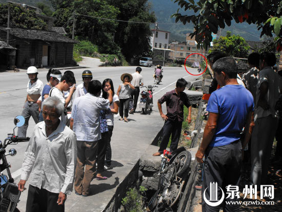記者昨日上午10時(shí)趕到位于永春達(dá)埔鎮(zhèn)東園村委會附近的事發(fā)現(xiàn)場時(shí),警方仍在現(xiàn)場勘察。據(jù)了解,死者張某泉今年38歲,家住在距東園村五六公里遠(yuǎn)的錢峰村!叭颂稍谶@個(gè)地方,摩托車卻翻倒在100多米外的水溝里!睆埬橙囊晃挥H戚指著路對面的涼棚告訴記者,張某泉的遺體就停放在那里。