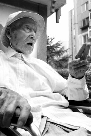 老人最喜歡吃的食品有牛奶、雞蛋、地瓜、香蕉、餃子、紅燒肉等。他從年輕時候起飯量就不大,從不暴飲暴食,現(xiàn)在每餐也只吃七八分飽,最喜歡的紅燒肉和餃子,也只吃五六口。社區(qū)醫(yī)院每月都來給老人檢查身體,老人各項指標(biāo)均正常,沒住過醫(yī)院,感冒發(fā)燒都極少。前幾天高溫,老人患了肺內(nèi)感染,也只打了3天吊瓶,多打一天他都不讓,而且堅決不吃藥,他說“是藥三分毒”。老人滿口假牙,吃飯時飯菜必須軟爛;眼睛有些花,報紙上的大字還能看清;一只耳朵失聰,另一只耳朵有點背,跟他說話得大點兒聲。