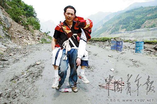 沿途,到處是成群結(jié)隊(duì)從映秀鎮(zhèn)逃出來的災(zāi)民。他們行色匆匆,臉上多半帶著惶恐和悲傷的神情。這時,我看見一個背著人的中年男子,朝我們走來。