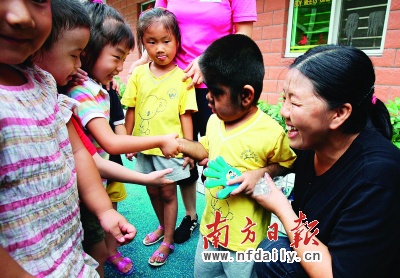 在數(shù)次聯(lián)系幼兒園遭拒后(本報(bào)7月23日曾作報(bào)道),“毛孩”文才昨日終于背上書(shū)包走進(jìn)梧桐山中英文幼兒園,開(kāi)始了他在深圳的“上學(xué)夢(mèng)”。昨日,和同齡小朋友在一起玩,毛孩臉上洋溢著幸福的微笑。而他的雙胞胎弟弟因沒(méi)有受到資助入學(xué)而傷心流淚!懊恕奔易寰戎こ虒<医M組長(zhǎng)田亞華表示,醫(yī)院“救命不救窮”,培養(yǎng)毛孩家族的自救意識(shí)對(duì)他們的心理矯正至關(guān)重要。