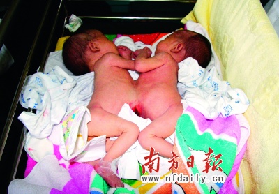 昨天,一對出生83天的連體女嬰(如右圖,丁玎向雨航攝),經(jīng)過3小時20分鐘的手術(shù),在深圳市兒童醫(yī)院順利進行了分離。據(jù)悉,這是市兒童醫(yī)院順利完成的第2例連體嬰兒分離術(shù),也是深圳市第2例。