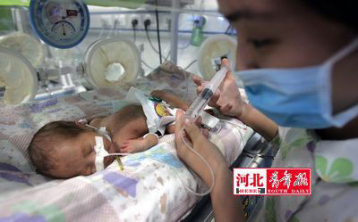 昨日,記者在醫(yī)院的新生兒監(jiān)護(hù)病房看到,三個(gè)小男孩兒都躺在保溫箱里。據(jù)兒科醫(yī)生介紹,三個(gè)孩子都是低體重早產(chǎn)兒,出生時(shí)孕周為33周多。老大是1.58公斤,老二和老三是1.55公斤,自3月16日出生到現(xiàn)在已經(jīng)度過了呼吸關(guān),還有感染關(guān)、喂養(yǎng)關(guān)、黃疸關(guān)在等待著他們。這兩天護(hù)士已經(jīng)開始通過鼻飼管注射給他們喂奶了,三個(gè)孩子每次分別給注射7毫升、3毫升和4毫升,2個(gè)小時(shí)喂一次。從目前來看,除老大有點(diǎn)貧血外,三個(gè)孩子心肺功能腦部發(fā)育都很好,預(yù)計(jì)還有2到3周孩子們才能出保溫箱。