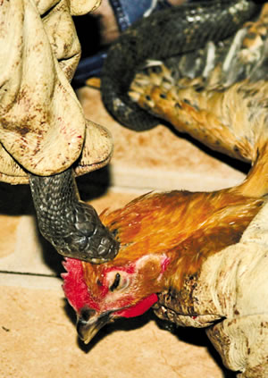 “表演馬上開始!”店里所有顧客都將眼光齊刷刷地盯著該男子的手。只見他左手將母雞死死按在地上,右手從鐵籠中隨手抓了一條長約1米的眼鏡蛇,用手卡住它的頸部。“啪、啪、啪!”只見男廚師不停地拍打著蛇的頭部,試圖激怒它,但眼鏡蛇仍一動(dòng)不動(dòng)。“怎么不咬呢?”幾名男子哈哈大笑,一些食客也一撥接一撥地走了進(jìn)來。