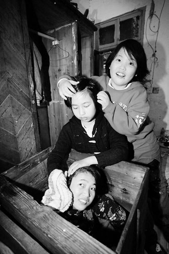 正對著門是一個長一米、寬半米、高約90厘米的木頭箱子,曾之的姐姐竟然就坐在箱子里!“姐姐站不起來,如果在床上或者別的地方就會亂爬,還會揀地上的臟東西吃,實在沒辦法只能讓她坐在這里面。”曾之邊說邊幫姐姐理了理頭發(fā),與姐姐相比,曾之明顯瘦弱許多,臉色也比姐姐黃。
