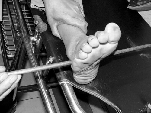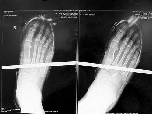 事發(fā)時男孩穿著一雙布鞋,骨外二科陳賓醫(yī)生操起剪刀,將布鞋一塊塊剪掉。經(jīng)X光透視,醫(yī)生驚奇地發(fā)現(xiàn):男孩雖然被鋼筋穿透了右腳,但骨頭、大的血管和神經(jīng)都沒受任何傷害!