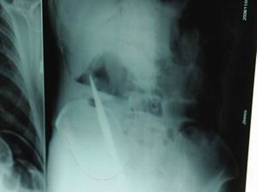 昨天(11月6日)上午,記者在徐州礦務集團總醫(yī)院重癥監(jiān)護室見到了這名男子,目前他雖然已經(jīng)恢復了意識,但還不能開口說話,需要呼吸機輔助呼吸。據(jù)醫(yī)生介紹,4日中午12時左右,這名男子因服毒輕生被緊急送到醫(yī)院進行搶救,之前,這名男子已經(jīng)在當?shù)剜l(xiāng)鎮(zhèn)醫(yī)院進行了近20小時的治療,但效果不佳!安∪吮晦D院到礦總院時已神志不清,血壓極低,處于休克狀態(tài)!本茸o人員給男子洗胃、初步處理以后,發(fā)現(xiàn)男子呼吸急促,于是趕緊給他拍片檢查。結果讓所有的醫(yī)生大吃一驚,竟有一把尖狀異物橫在該男子腹腔內!當天下午5時30分,輕生男子被推上了手術臺。經(jīng)過40多分鐘的手術,該男子腹腔被打開,手術醫(yī)生發(fā)現(xiàn),男子體內的金屬狀異物竟然是一把長19厘米的尖刀!
