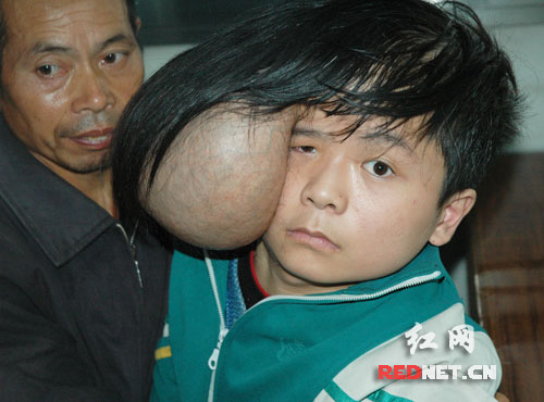 這名不幸的“雙頭”少年名叫梁樂,來自湖南耒陽。梁樂的父親梁某介紹,這個病兒子已經(jīng)患了10多年之久!皟鹤有〉臅r候頭很大,醫(yī)生檢查為腦積水,后來在衡陽一所醫(yī)院開了刀!绷耗痴f,過了一兩年兒子頭上突然長了個雞蛋大的“瘤子”,之后,隨著年歲增長,“瘤子”越來越大,到現(xiàn)在都長得有一個頭那么大了。由于兩個“頭”負(fù)擔(dān)太重,梁樂連站都站不穩(wěn),必須要父母親背著,每天晚上睡覺也只能仰著睡。