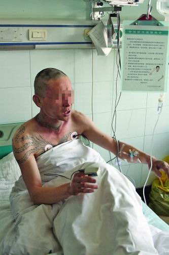中午12點,濟南市中心醫(yī)院燒傷病房,32歲、胸前文身的蕭某一臉痛苦。醫(yī)生初步檢查,他脖子及左手燒傷,幸無生命危險。雖死里逃生,但蕭某飽受煎熬。一方面,他對自己的自焚行為不后悔,“我該死!如果我死了,家里還能有點撫恤金”;可另一方面,他幾度落淚,“點火瞬間,我想起了家人!