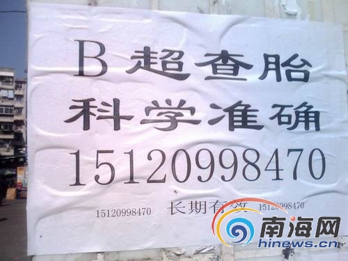 “只要你愿意花800元,肚子里懷的是男是女,一查便知!”連日來(lái)在海口的大街小巷內(nèi),出現(xiàn)了很多類(lèi)似的廣告。那么,這一明顯違反國(guó)家規(guī)定的行為究竟是怎么回事呢?1月13日至1月14日,記者連續(xù)兩天進(jìn)行暗訪,一探究竟。