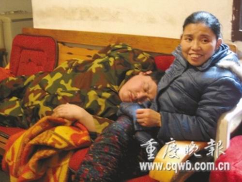 “亮亮,莫睡了,有人來(lái)看你了!鼻叭障挛,當(dāng)記者來(lái)到劉曉亮位于楊家坪街道天寶路的家時(shí),他正在客廳木制沙發(fā)上酣睡。身穿迷彩服的他,若不是露出的一雙光腳板,記者還以為是堆在沙發(fā)上的一堆厚棉絮。