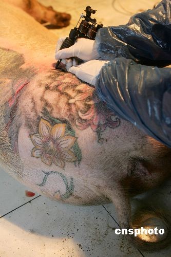 11月4日,記者前往比利時藝術家威姆德沃伊(Wim Delvoye)在北京郊區(qū)的“藝術農(nóng)場”,他在農(nóng)場里養(yǎng)的十幾頭豬只只價值連城,因為這些豬身上都被紋上包括世界知名品牌LV,或者人物、動物、神話故事等卡通風格圖案。這些紋身豬皮最高可賣到100萬元,因此這些紋身豬吃好喝好,過得比人還舒服。中新社發(fā) 富田 攝