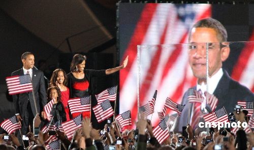 圖為奧巴馬與妻兒在芝加哥慶祝晚會(huì)現(xiàn)場。