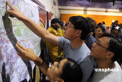 洛杉磯縣鉆石吧市被迫緊急撤離的華裔居民在庇護(hù)所內(nèi)查看最新火情圖,他們希望山火盡快撲滅,早日返家。中新社發(fā) 張煒 攝