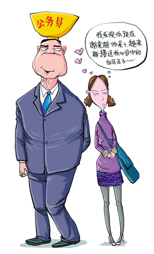“嫁個(gè)公務(wù)員,就像買(mǎi)了一只潛力股。沒(méi)漲的時(shí)候,收入穩(wěn)定,有福利保障,一旦升遷,隨著職場(chǎng)地位的提高,帶來(lái)的精神和物質(zhì)上的附加值是不可估量的!贝髮W(xué)畢業(yè)3年,在一家設(shè)計(jì)公司任職的黃露是一名資深“嫁碗族”,在她馬不停蹄的相親路上,對(duì)公務(wù)員總是大開(kāi)綠燈,“一聽(tīng)說(shuō)是公務(wù)員,好感會(huì)直線上升。”