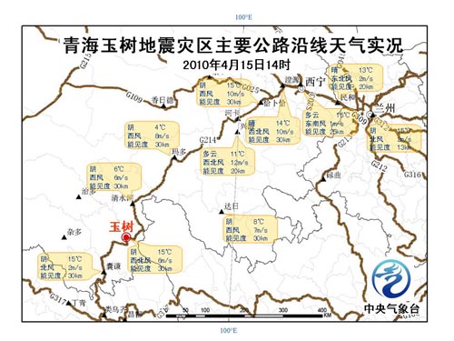 據(jù)悉此次專報重點針對青海玉樹地震災(zāi)區(qū)天氣情況和氣候背景進(jìn)行預(yù)報和分析,主要包括震區(qū)最新天氣實況、玉樹地震災(zāi)區(qū)未來5天天氣預(yù)報、道路交通氣象預(yù)報、決策建議以及玉樹地震災(zāi)區(qū)氣候背景分析和氣候趨勢預(yù)測等內(nèi)容。