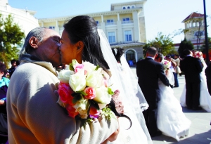 “你愿意做我妻子嗎?”81歲的吳介琴單膝跪地向愛人蔣曉輝求婚時,在場親朋給予3分鐘的掌聲。昨日,與另十對網(wǎng)戀成功的情侶一起,81歲的吳介琴與小自己23歲的蔣曉輝走進結(jié)婚殿堂。婚后他們將在四川生活。