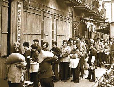 1982年,一個寒冷的冬天,人們在上海市中心的國營南市區(qū)第72號糧店門口排隊買米。排隊的人們把凍僵的雙手塞進口袋里或縮到袖子里。隊伍很長。王文瀾攝