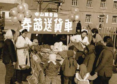 20世紀60-70年代商品短缺時期,年貨也需憑證配給。圖為黑龍江省哈爾濱市中山服務(wù)站的送貨車將年貨送到居民大院。來源:人民網(wǎng)