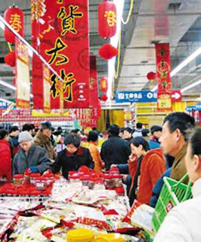 2002年春節(jié)前夕,南京中央金城倉儲超市別出心裁,在店內(nèi)辦起了“年貨大街”,市民可以在此將各種傳統(tǒng)年貨一站購齊,既經(jīng)濟又方便。來源:人民網(wǎng)