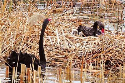 黑天鵝寶寶破殼出世,雄天鵝一直在窩旁巡視。 本報記者張斌攝