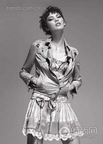 不想讓機(jī)車皮裝過(guò)分硬朗,那么內(nèi)衣外穿和粉嫩的短裙就是不可或缺的。