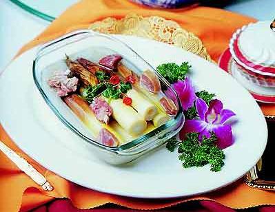 (5)春筍:被譽(yù)為“素食第一品”的春筍作為美味佳肴,自古以來(lái)備受人們喜愛。文人墨客和美食家對(duì)它贊嘆不已,有“嘗鮮無(wú)不道春筍”之說(shuō)。春筍筍體肥厚,美味爽口,營(yíng)養(yǎng)豐富,可葷可素。做法不同,風(fēng)味也各異,炒、燉、煮、煨皆成佳肴。地方名菜春筍均占一席之地,如上海的“枸杞春筍”,南京的“春筍白拌雞”,浙江的“南肉春筍”。不過(guò),北方很難吃到新鮮的春筍,如果是弗爾瑪林里泡過(guò)的就算了吧。
