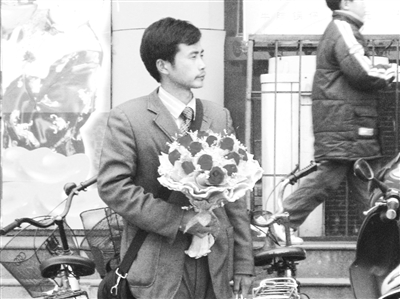 昨日上午9時(shí)許,記者在余家頭武商量販店門口看到,一個身體單薄的、穿藍(lán)色西裝的小伙子,手捧鮮花和禮品,在街頭等自己心愛的人已經(jīng)3天3夜了。記者看他面容已經(jīng)顯得有些憔悴,但是在記者和眾人的勸說下,他依然不愿離開,還要在那兒繼續(xù)癡癡地等待(見圖),以這種近乎瘋狂的求愛讓“女友”回心轉(zhuǎn)意。