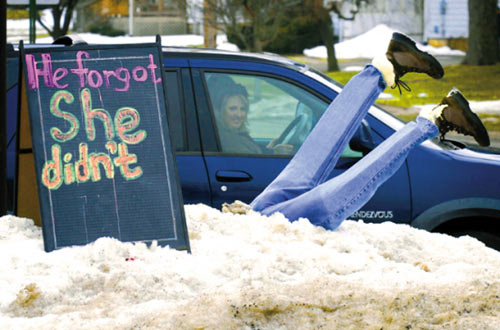 美國(guó)俄亥俄州謝爾比,一名開(kāi)車路過(guò)的女子被這一幕逗笑了:情人節(jié)前夕,一家花店外的一堆雪里,一名男模特人造模型的腦袋扎進(jìn)雪堆里,只露兩條腿,旁邊一塊黑板上用粉筆字寫著“他忘記了(情人節(jié)),但是,她沒(méi)有”,幽默地表達(dá)一個(gè)忘記在情人節(jié)給女友或者愛(ài)人買花的男人被扔出去的可憐下場(chǎng),充滿創(chuàng)意。