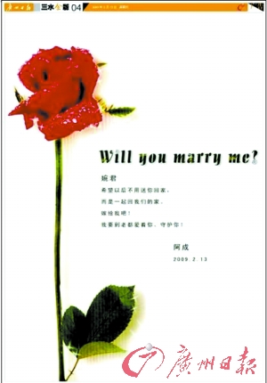 “婉君,Will you marry me?希望以后不用送你回家,而是一起回我們的家?——阿成”,為了趕在情人節(jié)前送女友一個難忘的感動,昨日,三水一位署名“阿成”的市民在本報三水金版上刊登整版求婚廣告,引起全城關注,求婚宣言讓許多市民大嘆“浪漫”,也好奇求婚記是否完美收場?記者找到了求婚者阿成和女主角婉君,還原甜蜜回憶。