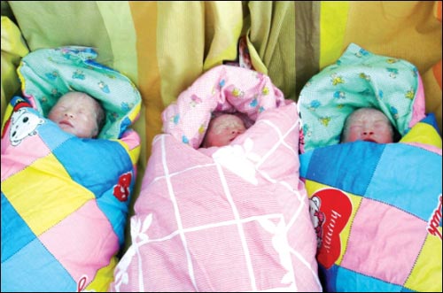 由于家里經(jīng)濟困難,這次直到懷孕5個月時,童芳才在丈夫的陪同下到醫(yī)院做B超檢查,發(fā)現(xiàn)懷的竟是三胞胎!爱敃r我又開心又擔(dān)心,開心的是竟然一次懷了三個,擔(dān)心的是怕三個全是女兒!蓖继寡。