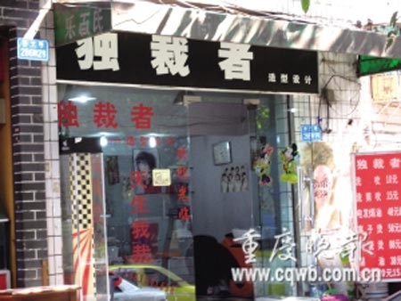 陳小姐所說(shuō)的理發(fā)店位于渝中區(qū)七星崗和平路,是家面積約6平方米的小店,黑色招牌上,“獨(dú)裁者”三個(gè)白色大字特別顯眼。小店玻璃門上寫(xiě)著“獨(dú)具匠心,天生我裁”。