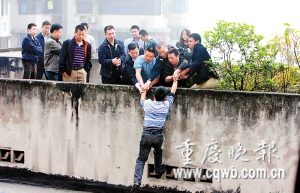 時(shí)間一分一秒過(guò)去,周周哭喊了將近兩小時(shí)!拔也惶鴺橇!9時(shí)許,被兒子哭聲警醒的嚴(yán)某,突然號(hào)啕大哭,雙腳從樓頂邊緣縮了回來(lái)后,向民警靠近。兩民警趁機(jī)上前,將其抓獲。