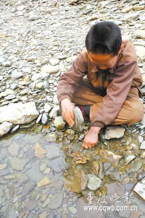 小軍又將記者帶到一旁的水塘邊,來回走了幾圈后,突然蹲下:“捉到一只!”記者一看,一只大大的癩蛤蟆被他捉在手里。