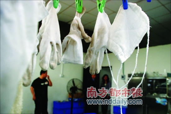 “要客戶收貨,就一定要讓所有的餐具上不能有一點(diǎn)油漬和殘?jiān)圆途叽虬b之前,一定要用手套或毛巾擦干凈!崩习迥飳τ浾哒f。然而,用于擦拭餐具的手套、毛巾都是隨處擺放,有的掛在電風(fēng)扇上,有的甚至放在地上。大部分手套的指尖部位都已經(jīng)發(fā)黑,甚至磨破了。