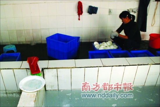 在這些水池旁邊,還有四五個盛滿水的藍(lán)色塑料箱,有一個箱子里表面上浮著泡沫,另外幾個的水則相對較清。這些塑料箱里均放滿了各種餐具,旁邊的地上還放著各種餐具,三四名女工正圍著這些塑料箱洗碗。一名女工表示,箱子里分別是洗潔精、漂白水和清水,用洗潔精洗過后,放在漂白水里漂兩次,再在清水里涮一下就行了。記者發(fā)現(xiàn),箱子里的水長時(shí)間不更換,即使是清水也有一股濃濃的異味。