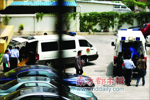 昨日上午10時(shí),記者在藍(lán)寶石名庭小區(qū)看到,警方封鎖現(xiàn)場(chǎng)后,進(jìn)入1103房勘查。中午12時(shí)20分,殯儀車(chē)和救護(hù)車(chē)開(kāi)到小區(qū)門(mén)口,一個(gè)年紀(jì)偏大的女人被抬上擔(dān)架送進(jìn)救護(hù)車(chē),殯儀車(chē)則將男尸拉走。