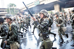 在泰國(guó)總理阿披實(shí)12日宣布曼谷和周邊5府部分地區(qū)進(jìn)入緊急狀態(tài)后,泰國(guó)軍隊(duì)和警察開始在重要路段部署兵力。13日凌晨4時(shí)30分,數(shù)百名士兵在丁當(dāng)?shù)貐^(qū)采取的驅(qū)散行動(dòng)中與示威者發(fā)生嚴(yán)重沖突。阿披實(shí)說(shuō),約70人在沖突中受傷,其中23人為士兵,大部分為催淚彈所傷,無(wú)人喪生。