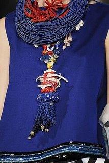 這串頸飾有些夸張,卻富有創(chuàng)意。使用紅白藍三色搭配藍色上衣,顯得十分活潑,也充滿了法蘭西的浪漫。