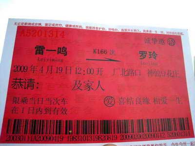 “太牛了,簡直就是個(gè)牛人。”昨日中午11時(shí)多,在婚禮現(xiàn)場,新郎的好友楊先生拿著明信片大小的“火車票”對記者說,原來來賓們手中所持的“火車票”都是結(jié)婚請柬,是由新郎雷一鳴自己設(shè)計(jì)的。