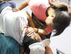 昨日下午3點(diǎn)多鐘,脖子血流不止的周方被救護(hù)車送進(jìn)市急救中心后拒絕進(jìn)入急診室接受治療。記者看到,周方的脖子左側(cè)有一道長(zhǎng)約6公分的刀傷,鮮血直流,染紅了白色T恤和頭上的棒球帽。醫(yī)護(hù)人員和匡非好不容易將他勸進(jìn)去,他卻趴在病床上痛哭不已,約10分鐘后,才平靜下來,接受了縫合處理。據(jù)醫(yī)生介紹,周方的傷口淺,未傷及主動(dòng)脈,無生命危險(xiǎn)。