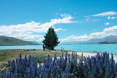 擱下行李我們一直向南而去,尋找皇后鎮(zhèn)南端的人間仙景蒂卡波湖。寂靜的湖面,四周覆蓋著蒼翠的樹(shù)木和盛開(kāi)的魯冰花,加上對(duì)岸雪山倒影,四季美景濃縮一簾。缺水的新西蘭島國(guó)對(duì)湖水的利用可以說(shuō)是費(fèi)煞苦心,海拔700多米的高山湖泊,筑了7條人工導(dǎo)流明渠,不但用以截流灌溉,而且,還在每一出水口修建了水利發(fā)電廠,7座電廠為南島的畜牧農(nóng)漁提供了豐裕的清潔能源?蒲腥藛T還在截流湖中試養(yǎng)原本生活在大海里的“三文魚(yú)”。第一次見(jiàn)到在淡水中游弋的“三文魚(yú)”,怎不叫人嘴饞!花上10個(gè)紐幣,我們吃上了活殺生食的淡水“三文魚(yú)”。說(shuō)實(shí)話,這人工飼養(yǎng)的淡水“三文魚(yú)”太肥太油膩,口感和味道遠(yuǎn)差海水“三文魚(yú)”一籌,但我還是由衷感到高興,這畢竟是人類(lèi)由漁到養(yǎng)的轉(zhuǎn)變,“三文魚(yú)”將永不枯竭。食罷魚(yú)宴,不久,我們的車(chē)已駛?cè)肓诵挛魈m著名的南島水果園,紅的櫻桃、粉的水蜜桃、黃的杏子、綠的蛇果,五顏六色的累累碩果,掛得樹(shù)條彎下了腰。為了充分利用水資源,每棵樹(shù)下均有一條微型水管進(jìn)行滴灌,晝夜較大的溫差,明媚陽(yáng)光的輻射和沒(méi)有污染的潔凈空氣,給水果提供了優(yōu)良的生長(zhǎng)環(huán)境,來(lái)到了果園,人人現(xiàn)摘現(xiàn)吃。導(dǎo)游見(jiàn)我從樹(shù)上摘下櫻桃還要在自己T恤上蹭蹭,便告訴我說(shuō),不用蹭,這里的水果很干凈。于是,我扔幾粒入口,原汁原味。
