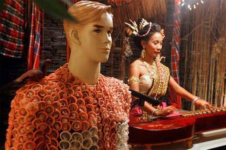 進入餐廳的室內區(qū),就像進入安全套的博物館。墻壁上都是全球具有代表性的安全套產品的展覽,按照國別分裝在各自的格子里,不同的材料、顏色、形狀,漫步一圈能大致了解安全套的發(fā)展史。屋頂的吊燈也以安全套作為裝飾,閃出不同顏色的光芒。餐桌設計也很獨特,桌面玻璃板的圖案是由安全套組合完成?繅Φ牟妥琅赃能欣賞到一幅幅被“加工”過的名畫,連舉世聞名的蒙娜麗莎也客串了一回安全套的宣傳大使,手中拿著安全套沖著客人微笑。