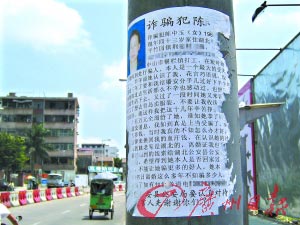 中山雅商律師事務(wù)所的律師封謨喜對(duì)記者表示,“公開把別人的身份資料貼在公共場(chǎng)合,這是違法的行為。輕則違反《治安管理處罰條例》,重則構(gòu)成了犯罪。如果貼了幾十張,這種行為其實(shí)算是比較嚴(yán)重了!贝送猓饴蓭煂(duì)記者表示,未經(jīng)審判,直接稱他人為“詐騙犯”,這也是侵害名譽(yù)權(quán)的行為。封律師表示,若認(rèn)定被詐騙可向公安部門報(bào)案(記者張堅(jiān)攝影報(bào)道)